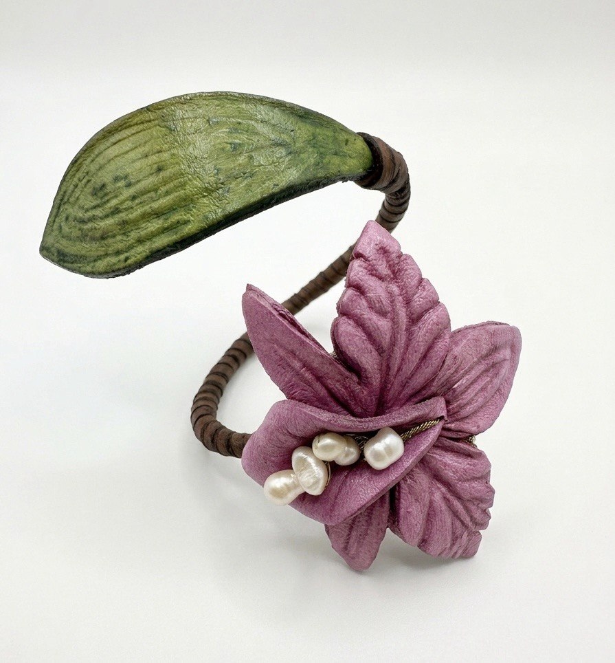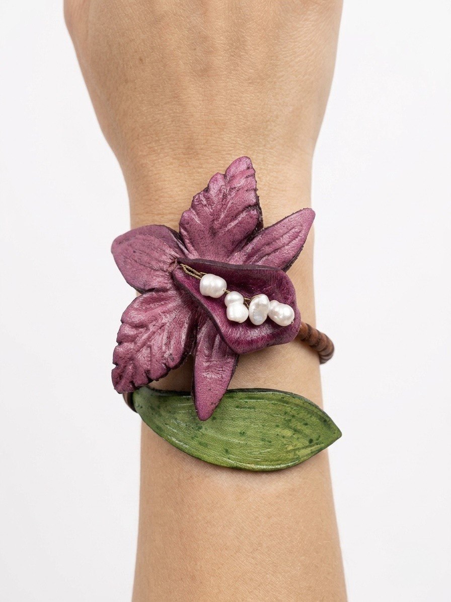 Elaborado con materiales de alta calidad, este brazalete destaca por su estructura rígida que lo puede moldear, se adapta cómodamente a tu muñeca. El contraste entre el verde orgánico de la hoja y el púrpura suave de la orquídea crea un equilibrio visual perfecto. Además, el detalle central de pequeñas perlas añade un toque de lujo discreto y feminidad clásica. Es la pieza ideal para eventos especiales, bodas de día o para elevar un look casual sofisticado.